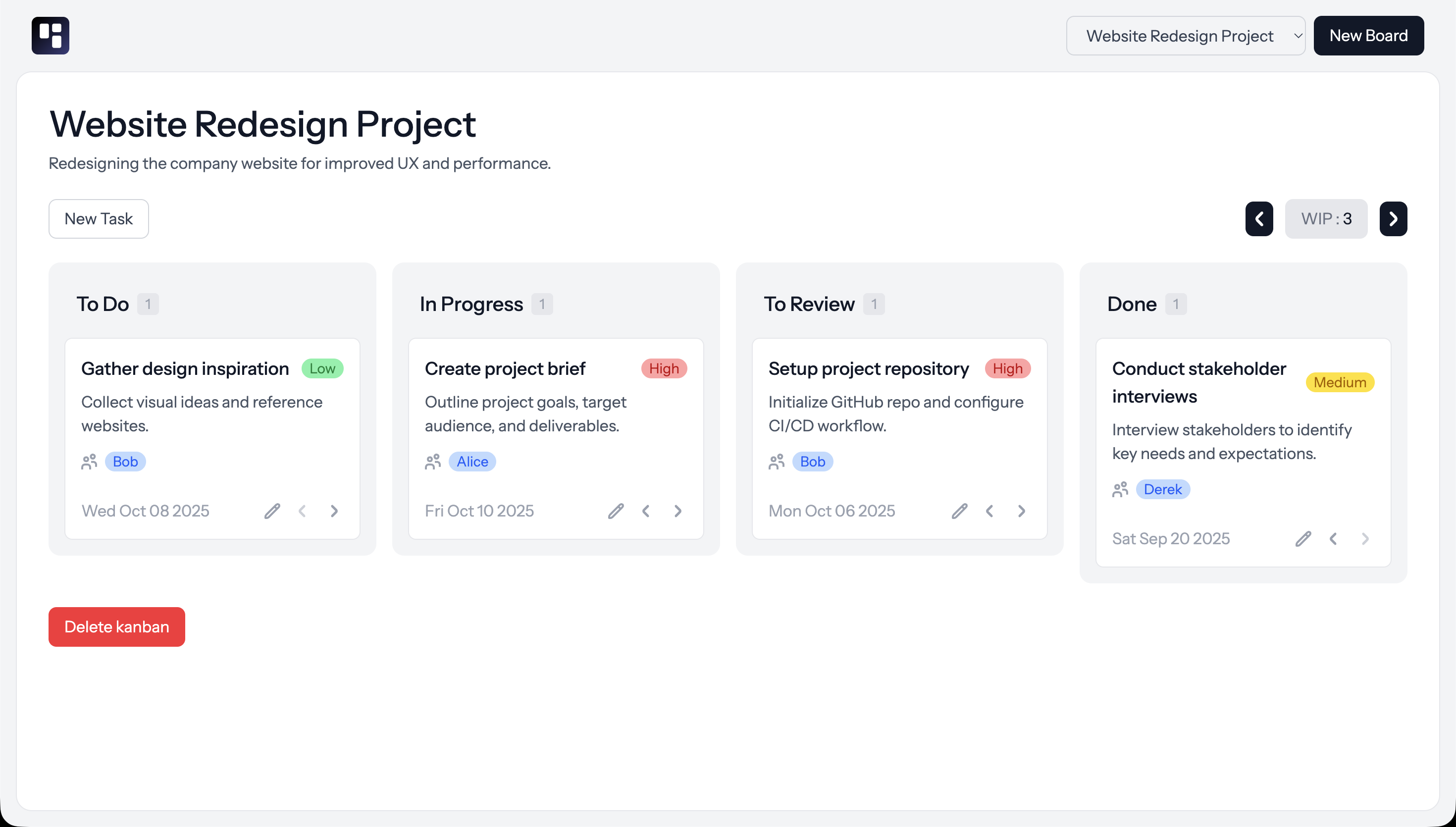 Application web permettant de gérer des tableaux Kanban dans le stockage local du navigateur.