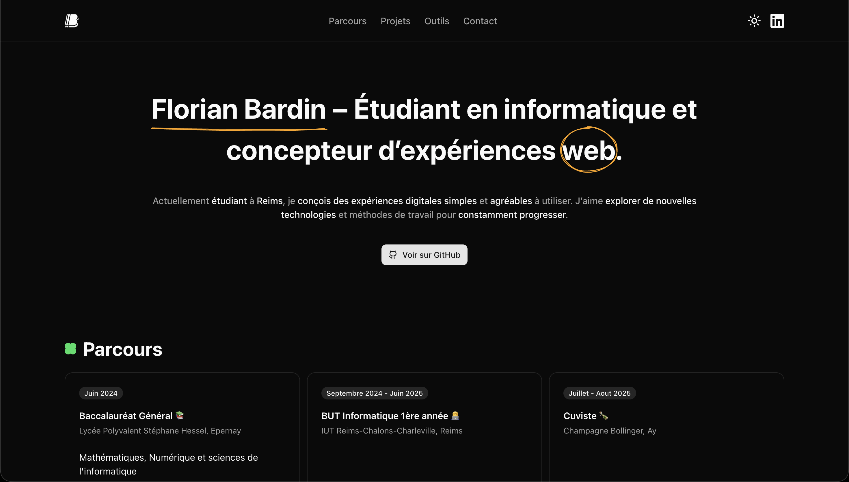 Site web portfolio regroupant mon parcours, mes projets, mes outils ainsi que mon contact.
